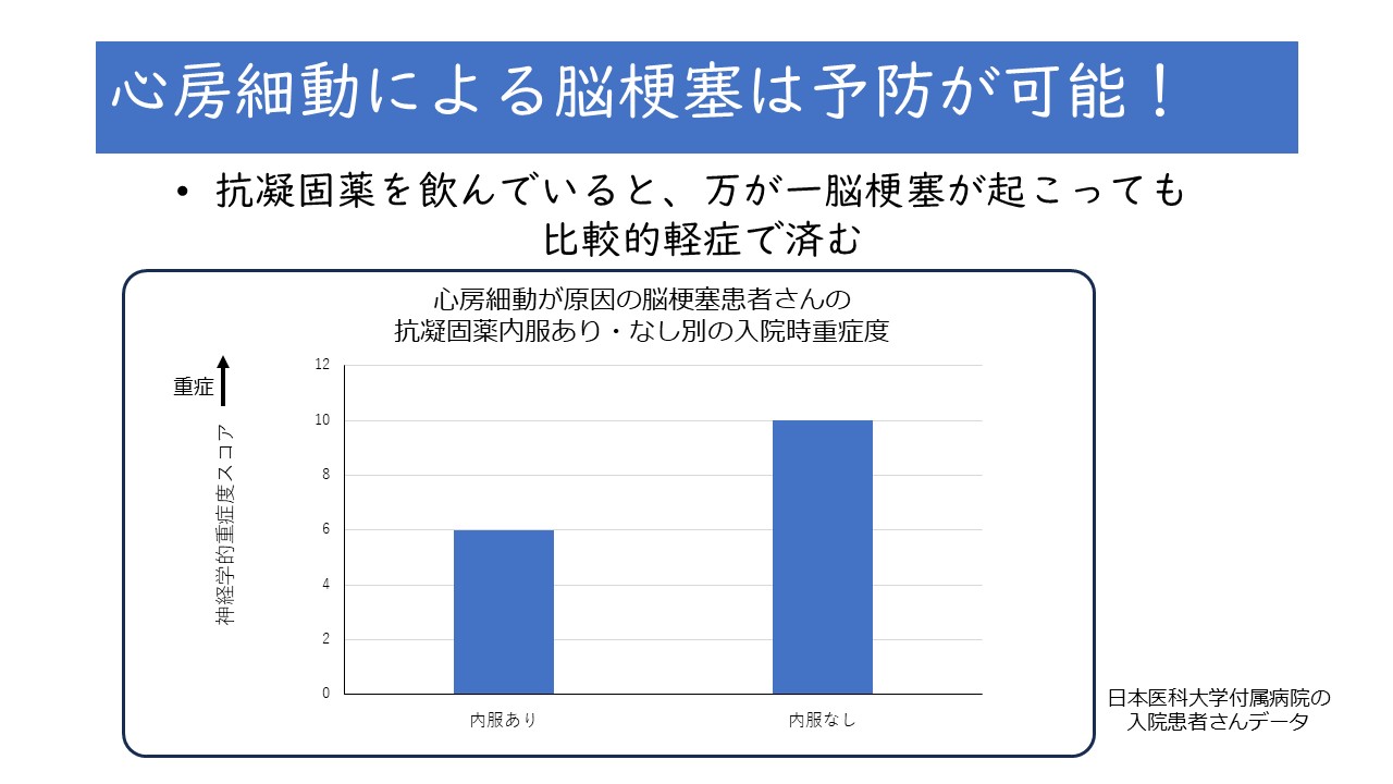 我々の日本医科大学付属病院で調べたところ、何らかの理由で抗凝固薬を飲むのを中止した患者さんで、脳梗塞が起こってしまった方の中止から脳梗塞発症までの日数は、1~7日が一番多くなっていました。今週、手持ちの抗凝固薬が切れるけど、忙しいから処方してもらうのは来週にしよう、などとは思わずに、薬が切れることのないよう定期的に飲んでいただきたいと思います。