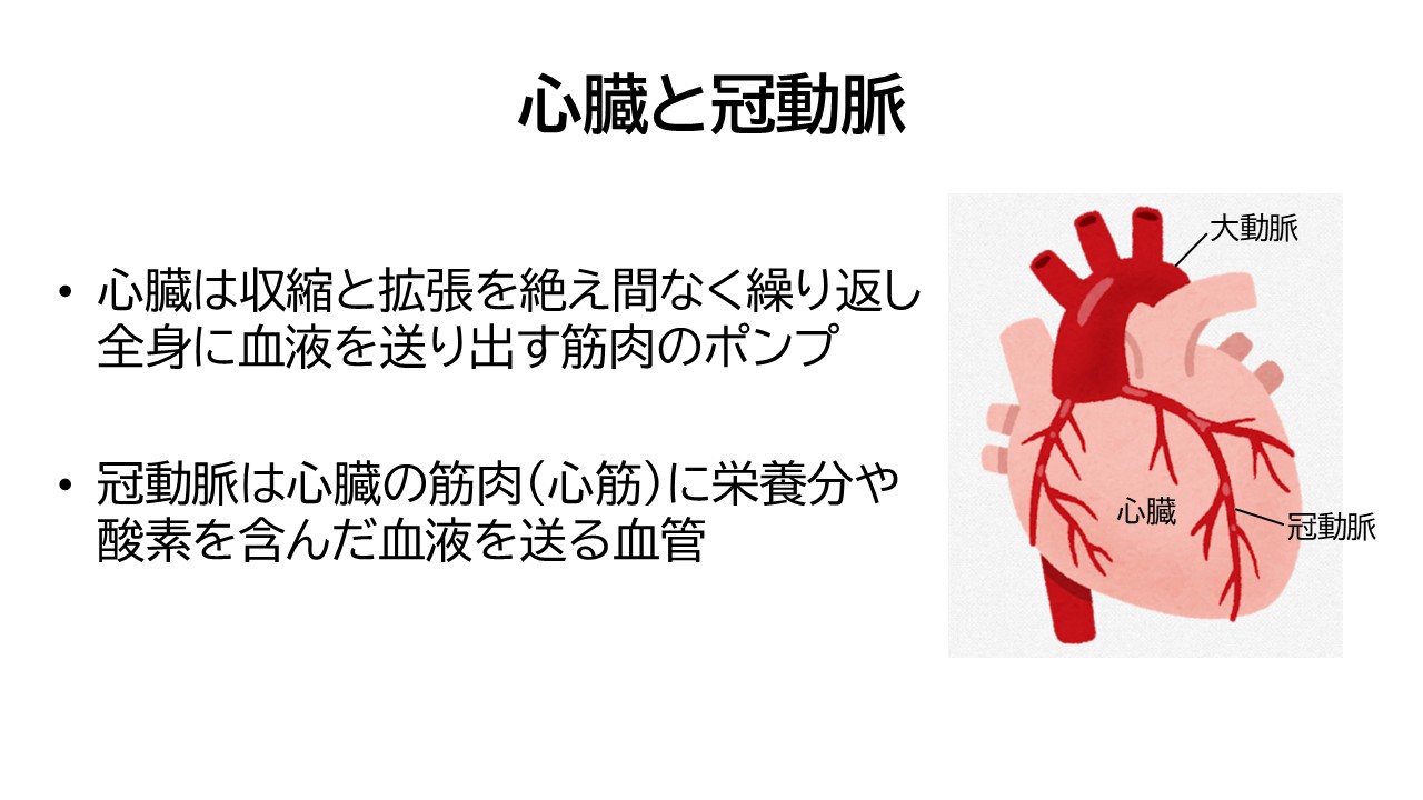 心臓は収縮と拡張を絶え間なく繰り返し、全身に血液を送り出す筋肉のポンプです。心臓は1日に約10万回、1年で約3650万回の脈を打っています。今日の公開講座のタイトルは「心臓と向き合う100年ライフ」ですが、100年ですと約36億5000万回にもなります。それくらい心臓は頑張って働かなくてはいけないので、その心臓を大事にするような仕組みが身体に備わっています。それが心臓の筋肉(心筋)に栄養分や酸素を含んだ血液を送る血管である冠動脈の存在です(図1)。図1 心臓と冠動脈