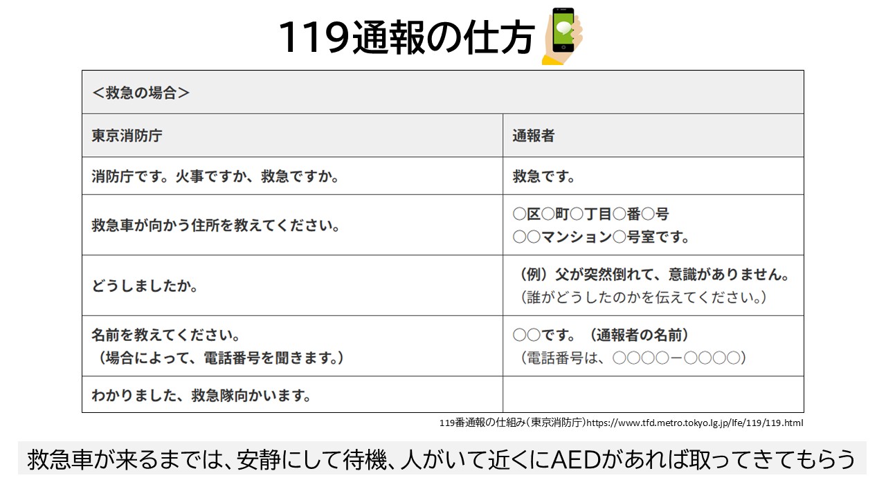 119番通報すると、まず火事か救急か、と聞かれます。救急です、と答えると救急車が向かう住所を聞かれます。それから具体的にどういった状況かをお話ししてください(表1)。