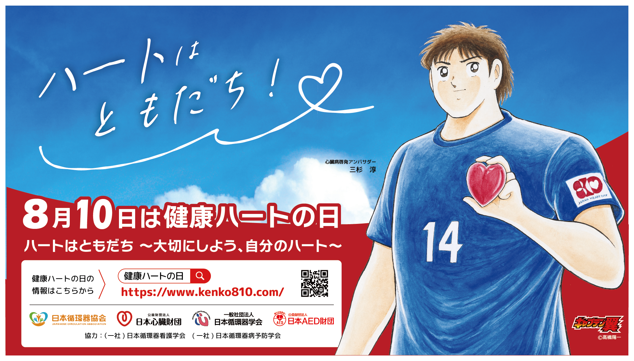 本年度の「健康ハートの日」(8月10日)啓発活動のキャッチフレーズは「ハートはともだち~大切にしよう、自分のハート~」です(図1)。これは漫画『キャプテン翼』のセリフ「ボールはともだち」にかけており、『キャプテン翼』の作者の高橋陽一先生に登場人物の一人である三杉淳のイラストをオリジナルで描いていただきました。漫画では三杉淳は心臓に持病がある天才サッカー選手の設定となっており、「健康ハートの日」の「心臓病啓発アンバサダー」として就任してから本年で三年目になります。図1 8月10日は健康ハートの日