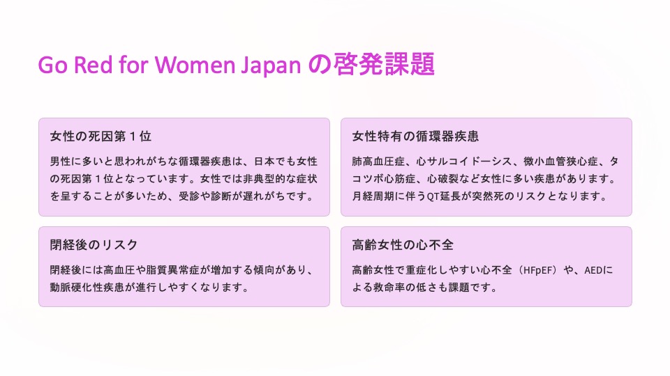 日本における啓発活動「Go Red for Women Japan」では、日本においても循環器疾患が女性の死因の第一位であること、女性特有の循環器疾患があること、閉経後のリスクがあること、高齢女性では心不全が重症化しやすいこと、などを広く知っていただくという課題があります(図2)。また女性特有の循環器症状についても知っておいていただくことが大事です。つまり非典型的な症状(女性では男性と異なる心臓発作の症状を示すことがある)、見過ごされやすい兆候(極度の疲労感、めまい、吐き気、背中や顎の痛みなど非典型的な症状がある)、症状の持続時間(症状が長く持続することがあり、緊急性が認識しにくい傾向がある)、といったことなどが挙げられます。